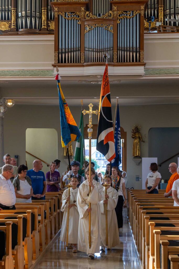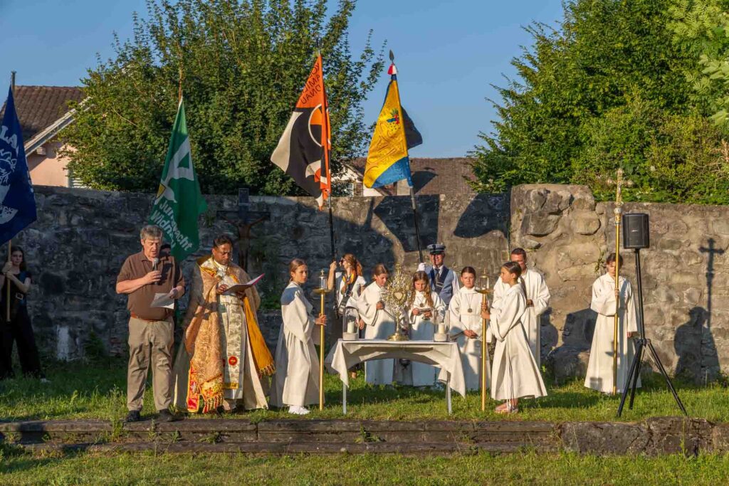 Bei warmem, sonnigem Wetter konnte dieses Jahr das Hochfest Fronleichnam gefeiert werden. Die Erstkommunikanten durften nochmals in ihre weissen Gewändern in die Kirche einziehen. Musikalisch umrahmt wurde die Feier von der Musikgesellschaft Konkordia. Bei der Prozession waren die Musikanten und die Fahnendelegationen von den Vereinen: Jungwacht, Blauring, Konkordia und Kolping auch dabei. Anschliessend waren alle im Schatten des Pfarrgartens zum Apéro eingeladen, bei welchem einige Kolpingmitglieder halfen.